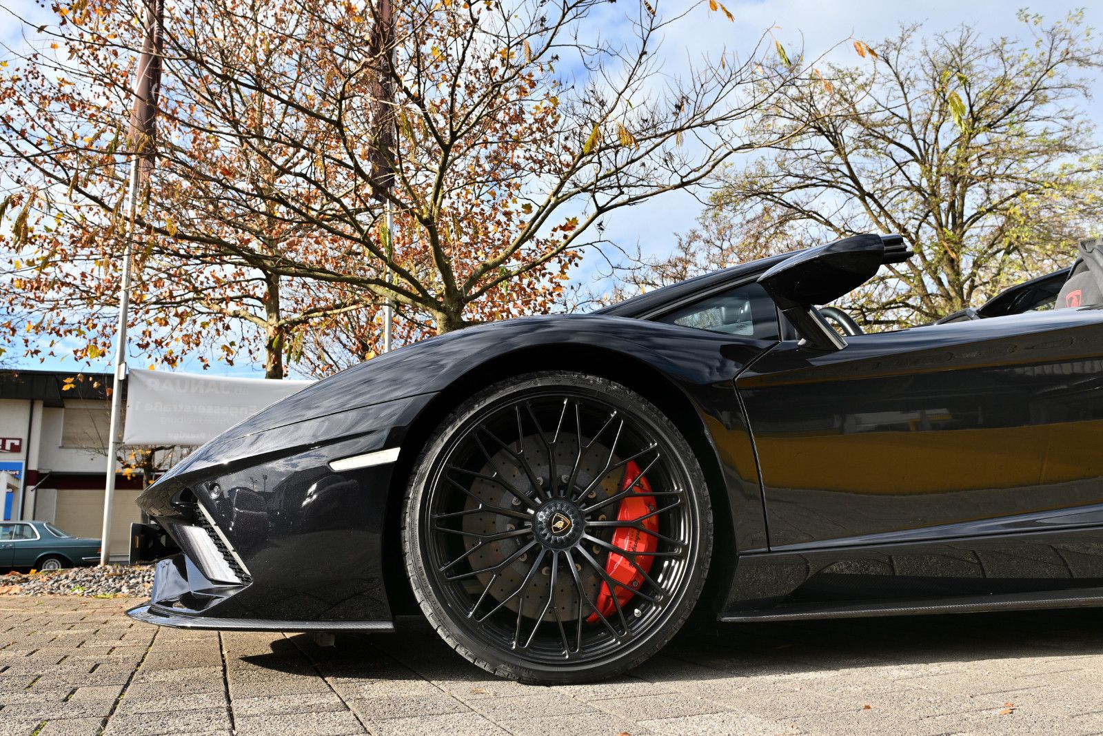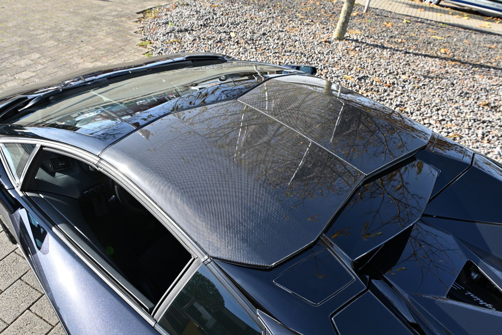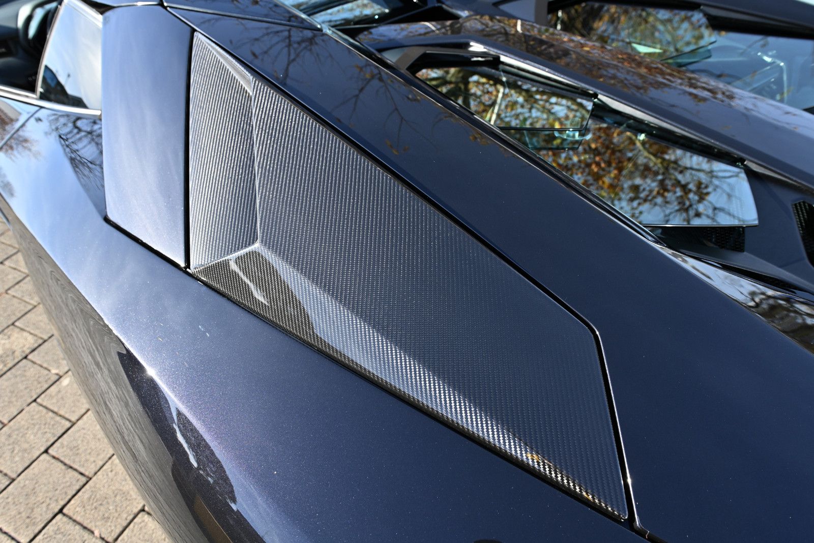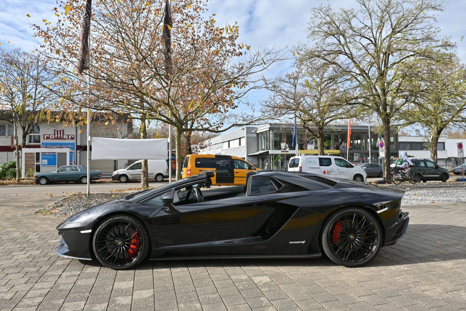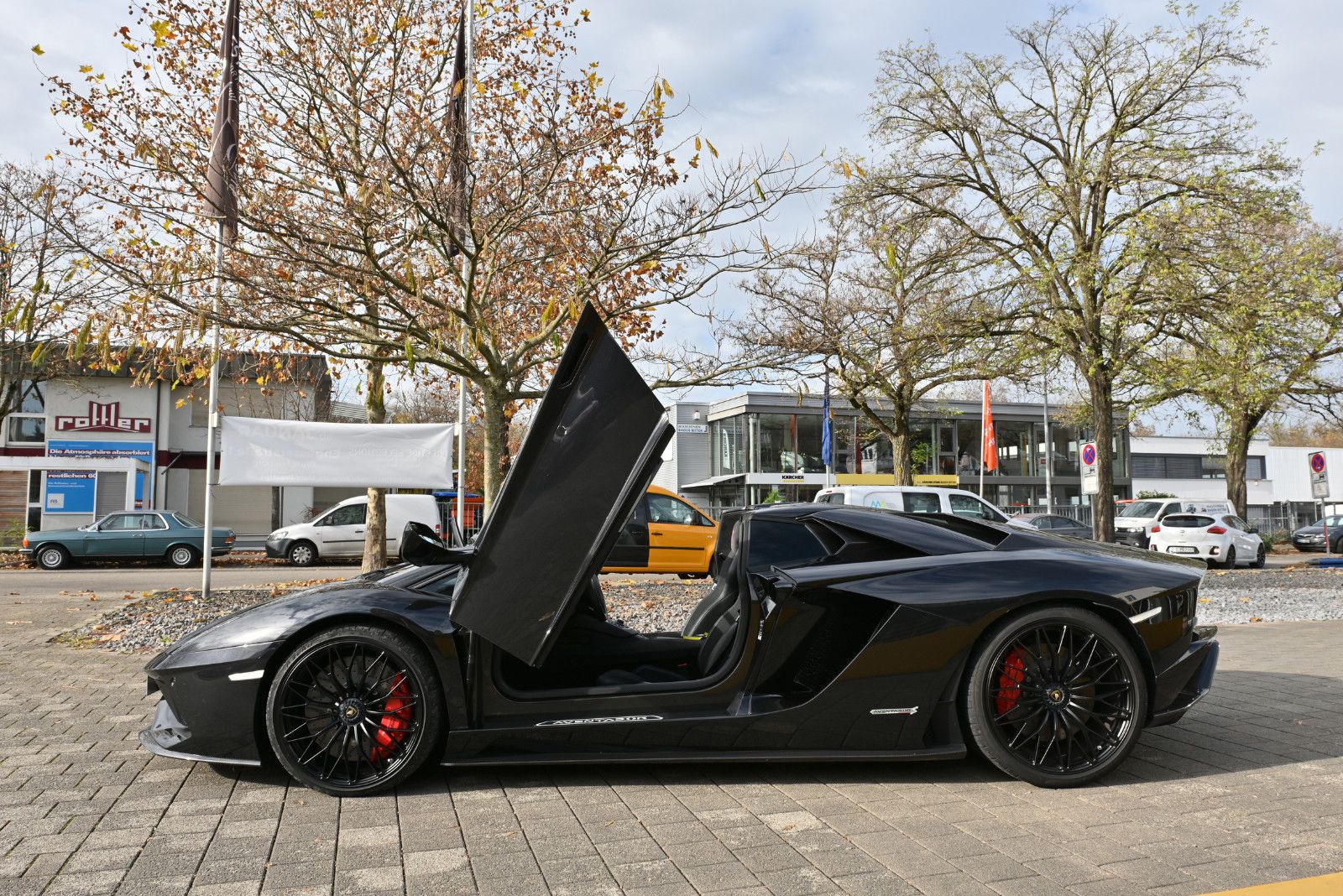 Wir bieten Ihnen hier einen Aventador S Roadster - in seiner Optik ein rassiger durch & durch Aventador...bissig böse, intensiv! Das Schwarzmetallic, mit dem vielen Carbon, dem ganz tiefschwarzen Interieur, mit nur roten Bremssättel & rot gestickten Logos - ein Knaller!