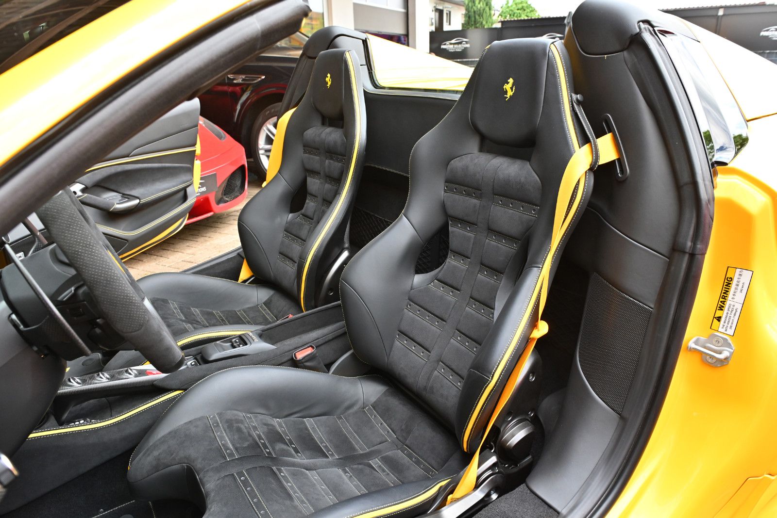 Das sagehafte Giallo Triple Strato leuchetet nobel-sportlich, die großen handlackierten Scudetti sind typisch für die rassigen Ferrari der 1950/60ger, die Schalensitze und das viele Alcantara, sowie das matte Carbon im Interieur verkörpern den Motorsport! Der zentriert lackierte Mittelstrich auf dem Lenkrad - genauso aus dem Motorsport...dieses F8 Spider ist sicher einer der einmaligsten je gebauten F8 Spider & verkörpert durch & durch wofür diese Baureihe stand: rassiger Motorsport!